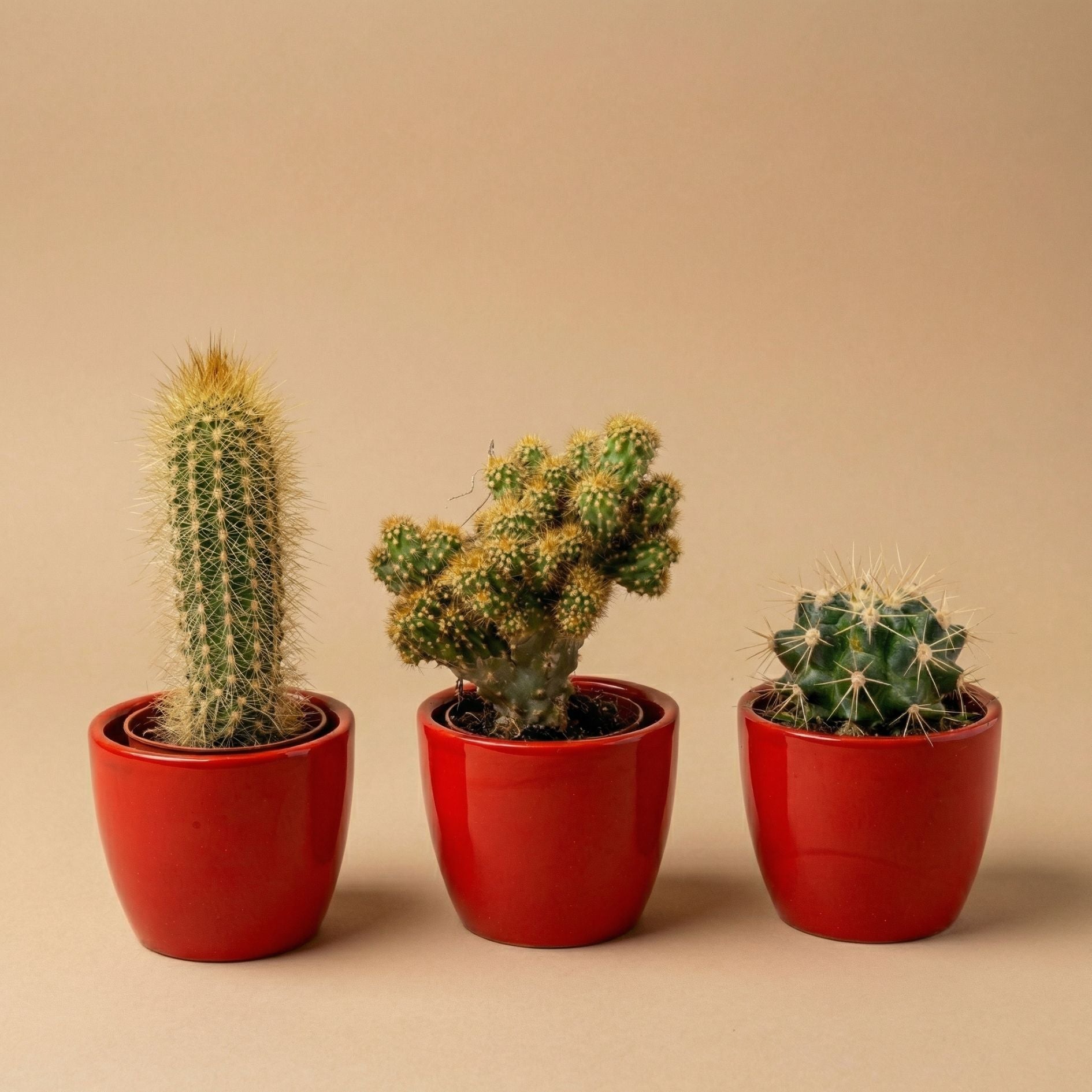 Cactus Set of 3 with Red Mini Pot - Mixed Live Cacti - ↑ 8–12 cm
