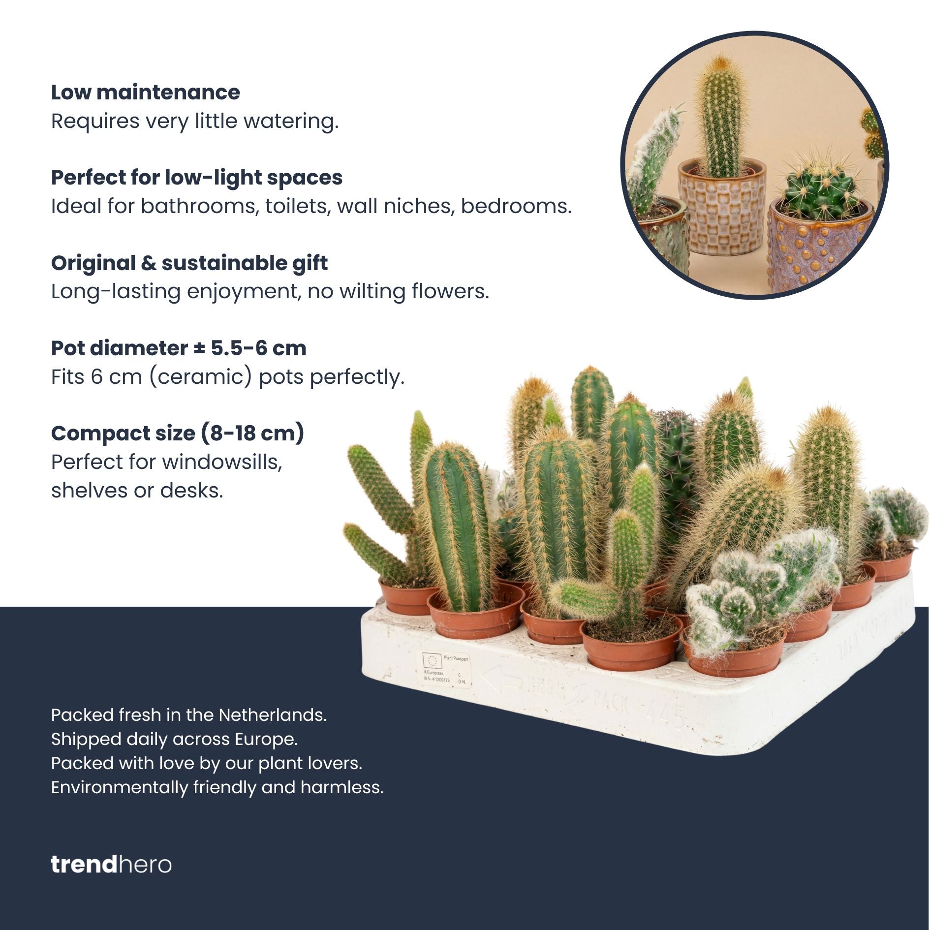 The cacti are hand-picked from a varied mix, no two sets are exactly alike. Ordering more than one set? We’ll always aim to give you as much variety as possible.